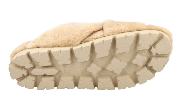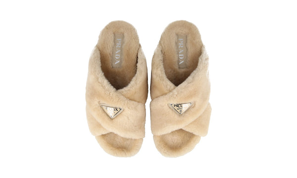 Prada Men's Beige Leather Shearling Fur Schaf Fell Slides Sandals Sandalen Sandals 2X3103