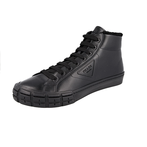 Prada Men's Black Leather Casetta Wheel Shearling High-Top Sneaker 2TG171