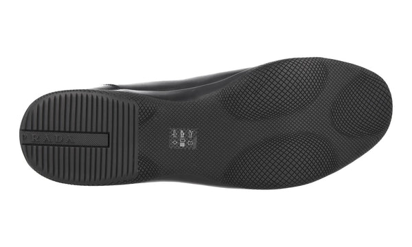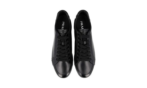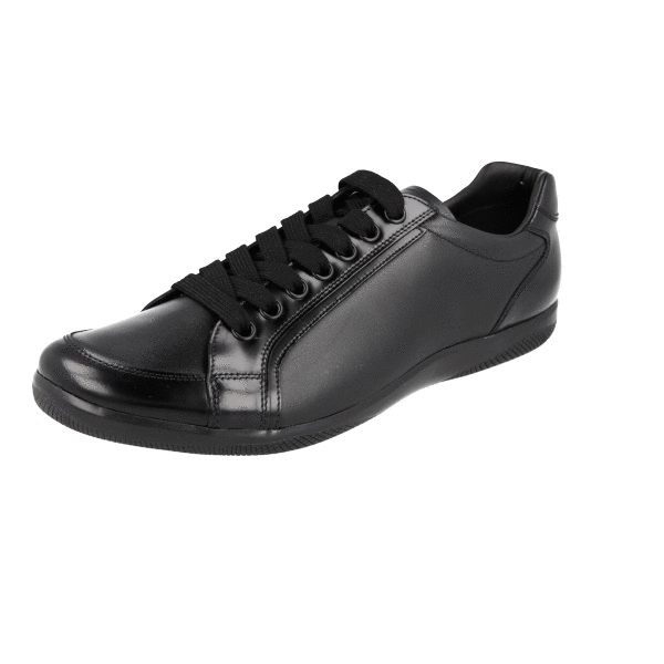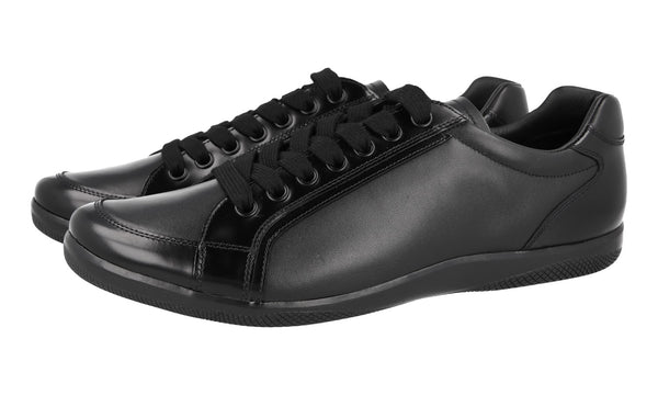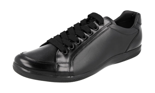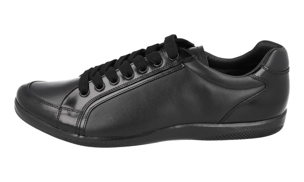 The Prada Men's Black Leather Offshore Sneaker DNC111 epitomizes contemporary luxury footwear. Crafted from premium genuine calfskin leather, this sophisticated sneaker combines refined Italian craftsmanship with modern design sensibilities. The sleek black colorway and understated elegance make it an essential addition to any discerning gentleman's wardrobe. Model DNC111 1OS3 F0002 features the exclusive PLUME + SPAZZOLATO leather combination, delivering a distinctive aesthetic with exceptional durability. Perfect for elevating casual ensembles with understated sophistication and timeless style.