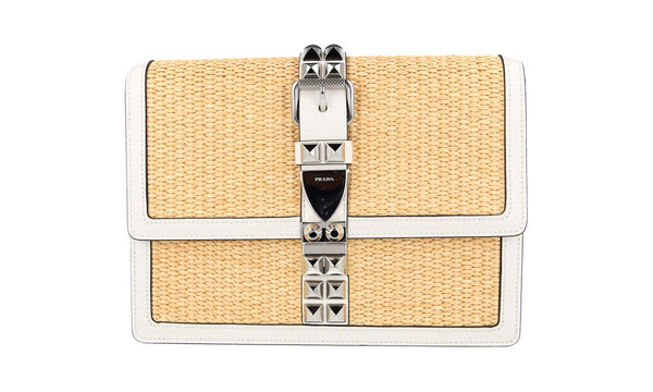Prada Women's Beige Leather Elektra Wicker Crochet Raffia Shoulder Bag 1BD174