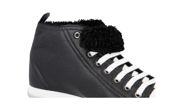 Prada Women's Black Leather Shearling Fur Cassetta Wheel High-Top Sneaker 1T508M