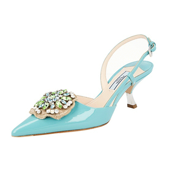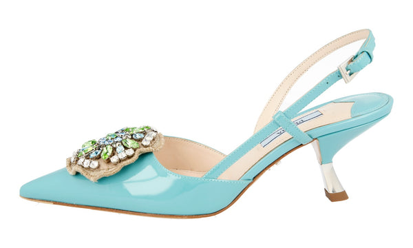 Prada Women's Turquoise Leather Slingback Crystal Brooch Pumps / Heels 1I016G