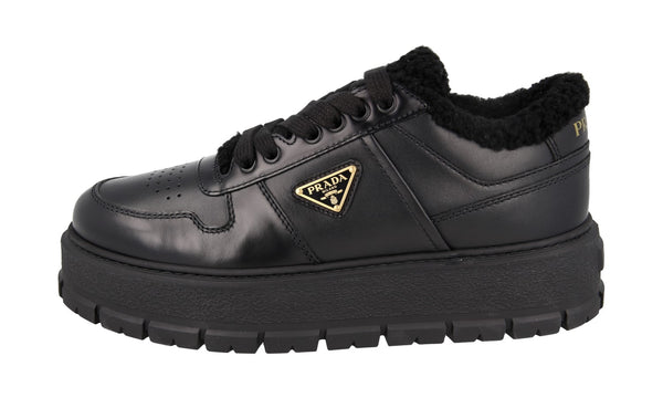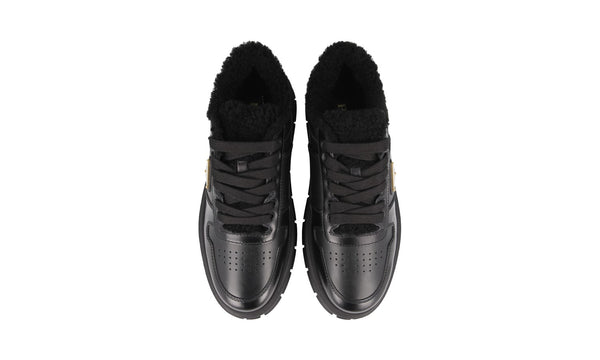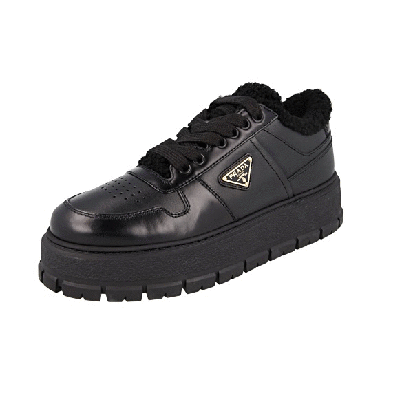 Prada Women's Black Leather Downtown Bold Shearling Fur Platform Sneaker 1E947M